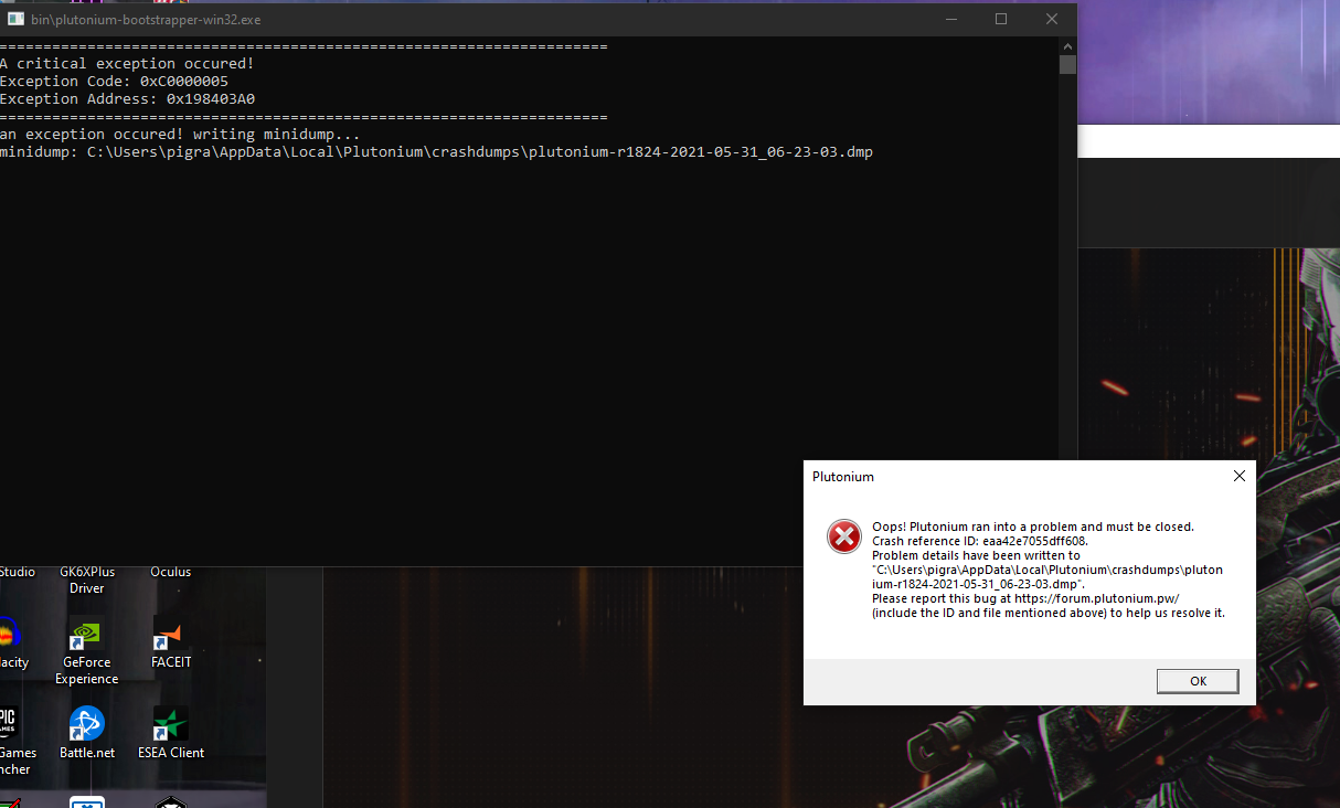 @enahsdotexe This crash is not related to Plutonium itself but likely some other software causing it to crash / a driver issue