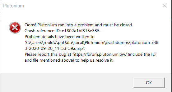 https://mega.nz/file/VvAVXYgZ#tX0vUGG6qNibXr7pyuoOV3WKzatyXkNiC0RWyps18XQHello, I hope I can see to it that this is resolved quickly. I should start off and address this is my first time using this forum and this service. The Plutonium launcher works properly and to my knowledge, everything sets up correctly. But upon pressing "Play" on either Zombies or Multiplayer, this error occurs and crashes it.
