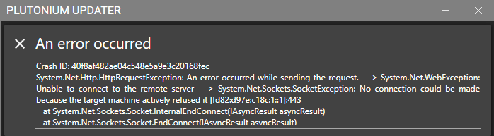 This pops up every time i try to launch plutonium. I cannot find the crash ID anywhere on the forums. -