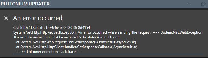 System.Net.Http.HttpRequestException: An error occurred while sending the request. ---> Sуstem.Net.WebException: The remote name could not be resolved: 'cdn.plutoniummod.cоm'